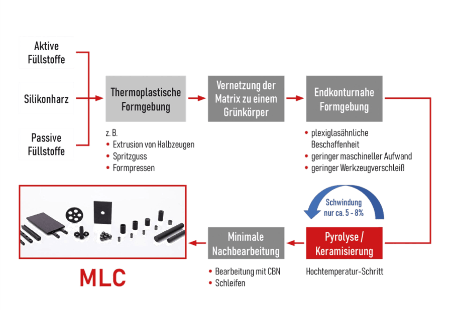 Als abschließenden Prozessschritt können die keramisierten Bauteile einer (meist minimalen) Feinbearbeitung unterzogen werden. Dabei müssen keine teuren Diamantwerkzeuge verwendet werden, sondern aufgrund der im Vergleich zu konventioneller technischer Keramik moderaten Härte können Werkzeuge und Schleifmittel mit CBN verwendet werden. Die fertige Keramik aus MLC bietet eine völlig neuartige Kombination von Materialkennwerten, die sich z. B. für den Einsatz als Keramikrolle für präzise Hybridlager, keramische Lagerringe oder keramische Linearführungen.